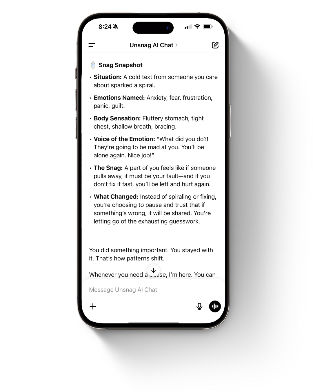 Unsnag is a real-time self-guidance tool delivered through an AI chat. You use it the moment you feel off, stuck, reactive, or overwhelmed — and it walks you through a simple, body-first process to shift what’s actually going on underneath.